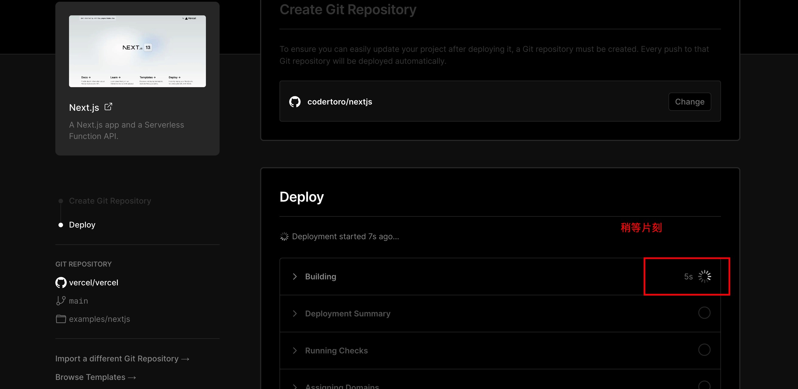 - 注册并登录(方法)并打开vercel首页,按下图依次点击